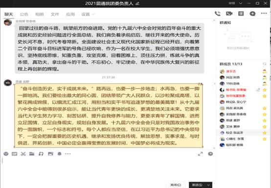 各部门学生通过线上学习,对全会精神有了更深层次的理解,对新中国百年征程有了更为深刻的体验,并在会后积极主动撰写全会感悟。同学们纷纷表示,要肩负起历史使命,努力成为堪当民族复兴重任的时代新人,让青春在不懈奋斗中绽放绚丽之花。