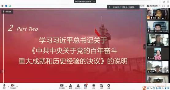 党员突击队队长白延军老师说明此次学习的重点与意义。他强调虽然线上学习的形式稍显简单,但希望同志们认真对待组织生活,保持“团结紧张,严肃活泼”的传统,结合抗“疫”的所见所闻、所思所行,更深入地理解十九届六中全会精神。随后薛喆同志引导大家学习十九届六中全会通过的《中共中央关于党的百年奋斗重大成就和历史经验的决议》以及习近平总书记对此的说明。通过学习两份重要文件,同志们对六中全会议题的必要性逻辑上更加贯通,对党的百年奋斗重大成就情感上更加崇敬,对党的百年奋斗历史经验认识上更加深刻。回顾历史,是为了展望未来,认清现实,从中汲取智慧与力量,更加勇毅地前行。同志们对自己身为青年,重任在肩的历史使命有了更深厚的体会。