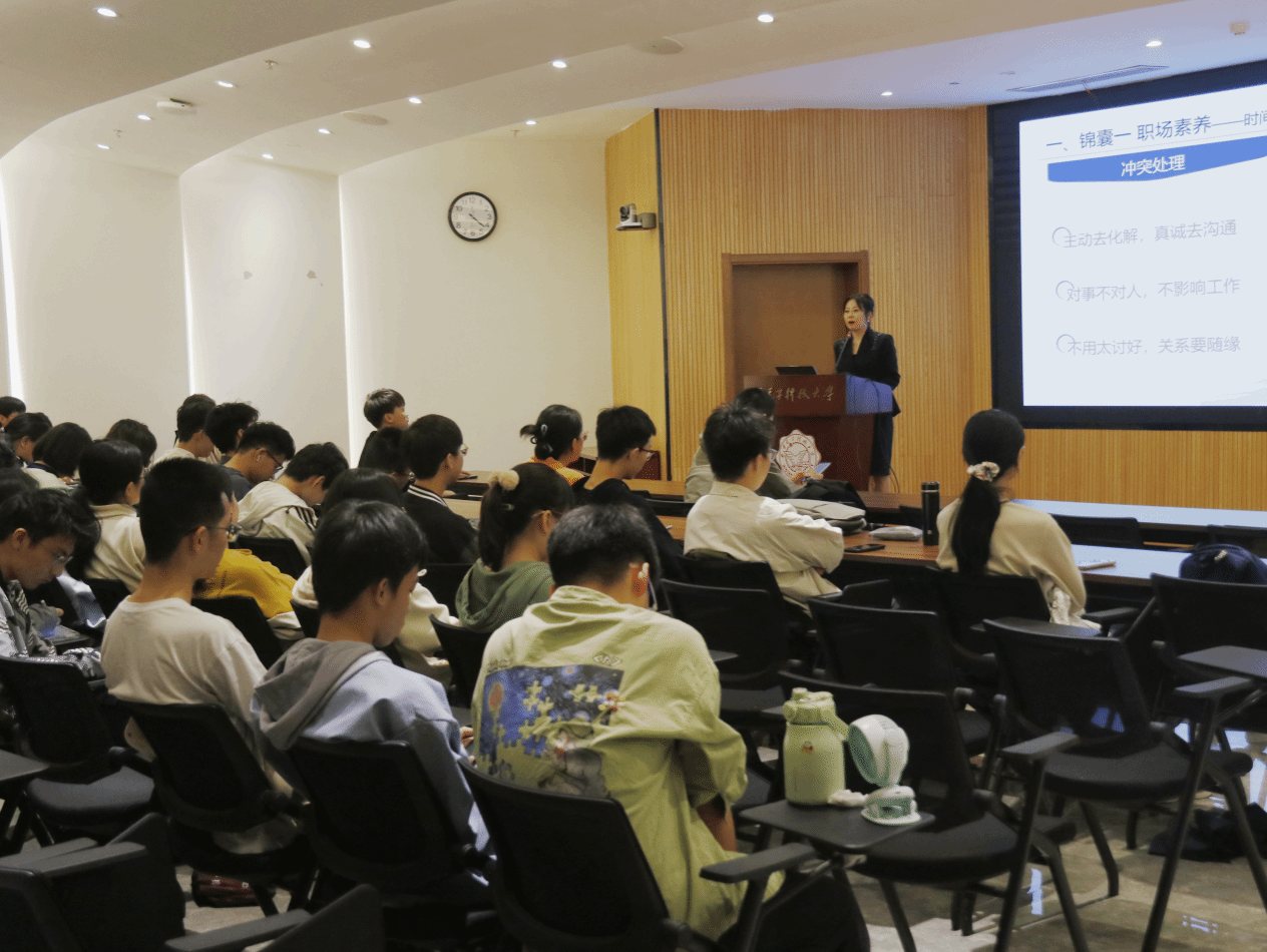邀请PTT国际职业培训师、国家注册礼仪培训师、四川九洲集团资深人力资源管理师王秋霞进行分享指导,她以“华丽转身的锦囊妙计”为题,帮助同学们提升职业素养和基本礼仪。