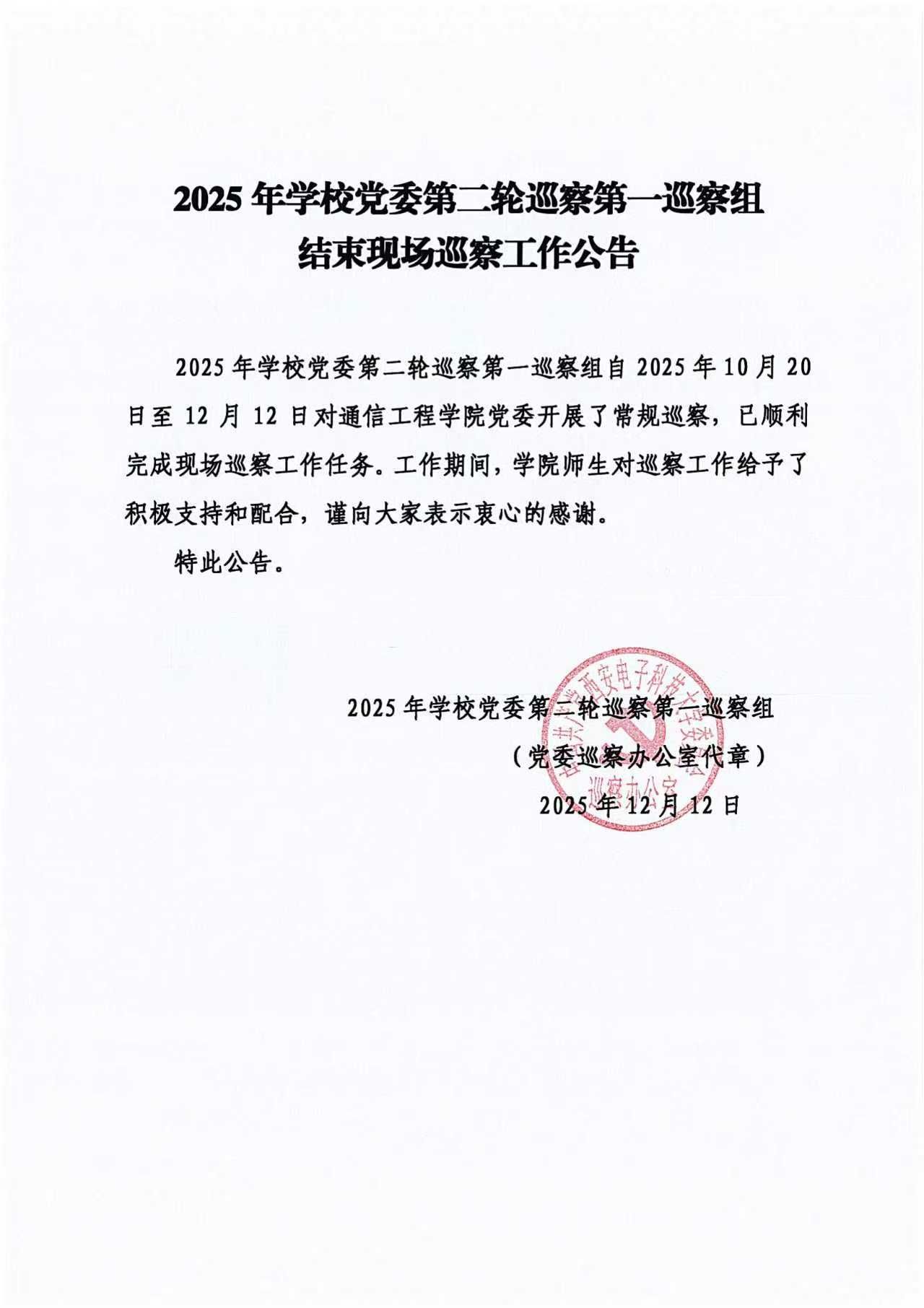 2025 年学校党委第二轮巡察第一巡察组结束现场巡察工作公告
